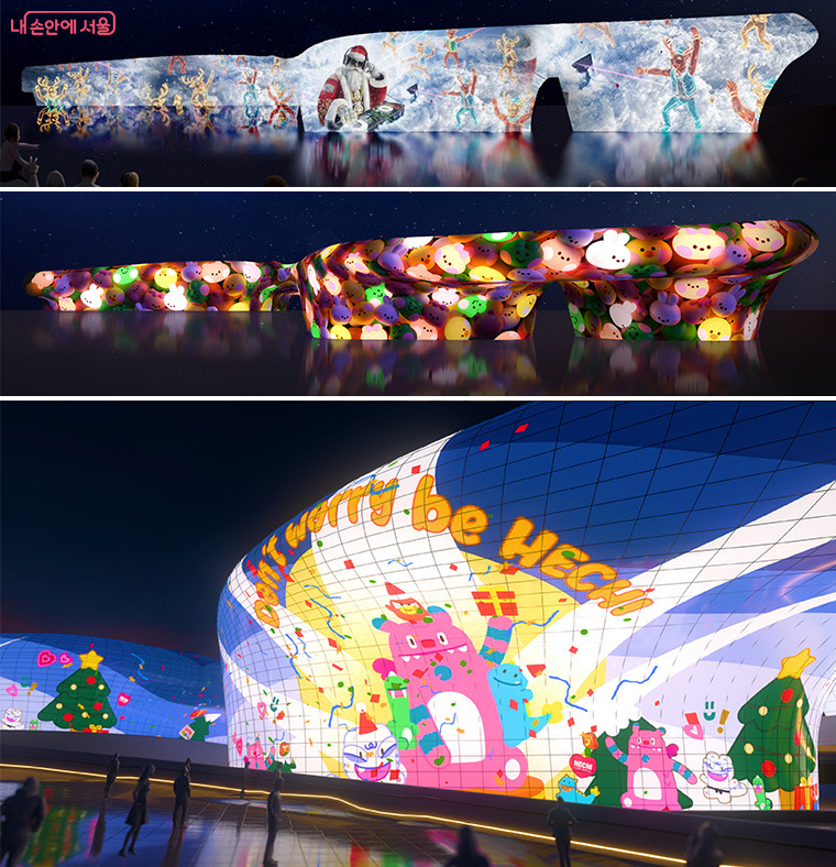 ‘서울라이트 DDP’는 해치, 라인프렌즈 등 국내외 인기 캐릭터와 협업한 대형 미디어파사드를 선보이고, 상설 야간 조명과 연계한 ‘크리스마스 타운’, ‘힙(HIP) 산타’ 이벤트 등 다양한 프로그램을 준비하고 있습니다.